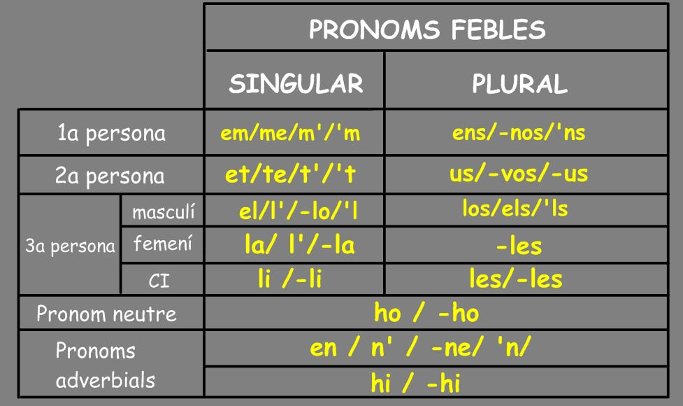 - Són els que substitueixen els complements verbals. Es pronuncien sempre units al verb i adopten formes diferents segons la posició que ocupen. Poden escriure's davant o darrere del verb.